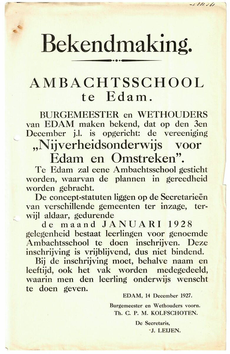 In 1910 ontstond in Edam al het plan om een ambachtsschool op te richten, omdat er een groot tekort was aan geschoolde arbeidskrachten. Maar pas na de afsluiting van de Zuiderzee kwam er beweging in Den Haag. De gemeente Edam maakte in 1927 de oprichting van de vereniging Nijverheidsonderwijs voor Edam en Omstreken bekend en vroeg opnieuw om steun met als doel een technische school voor met name leerlingen uit Edam, Volendam, Monnickendam en Marken. Later volgden ook leerlingen uit plaatsen als Kwadijk, Middelie, Warder, Beemster en Purmerend een opleiding aan de school.