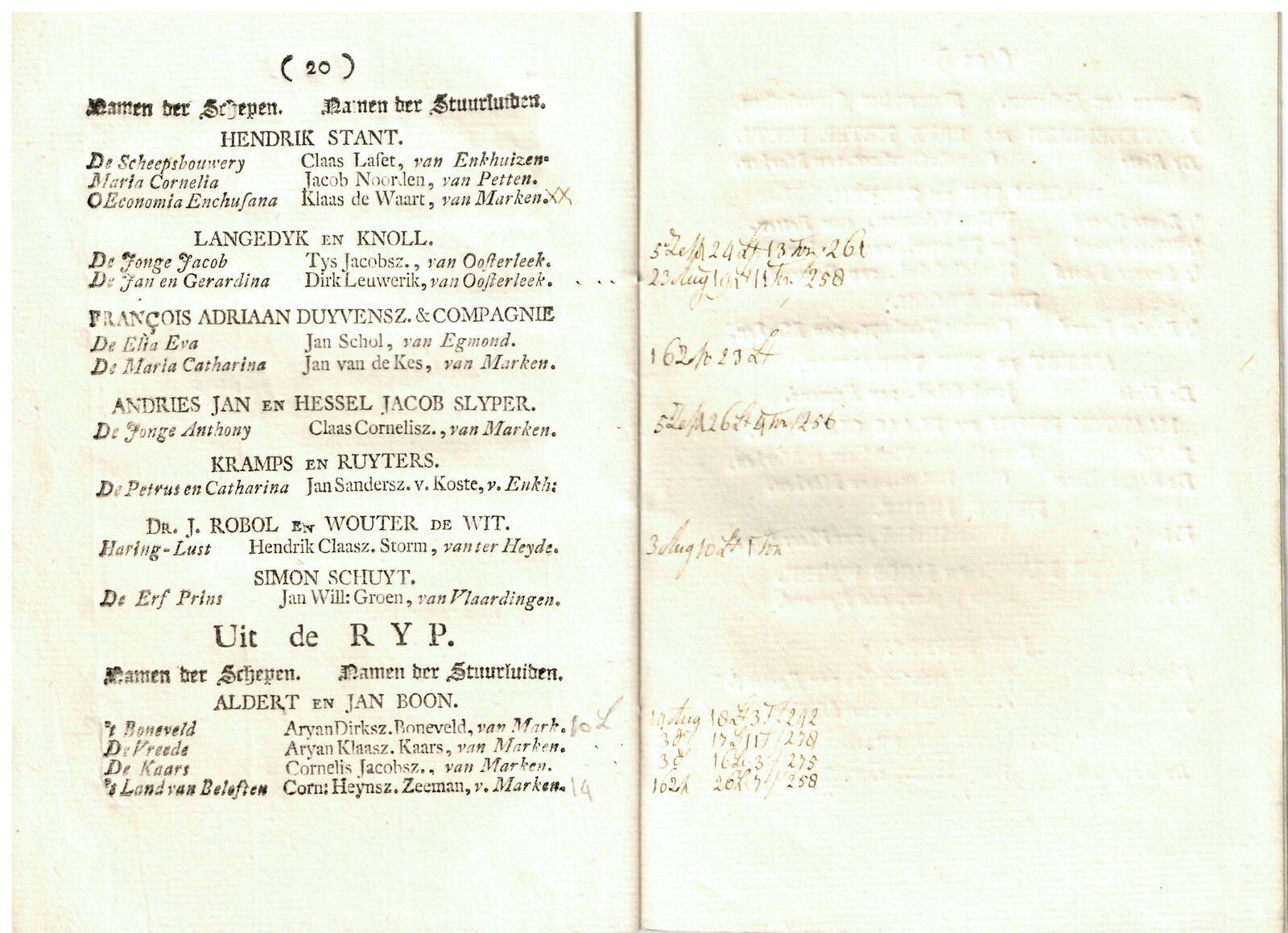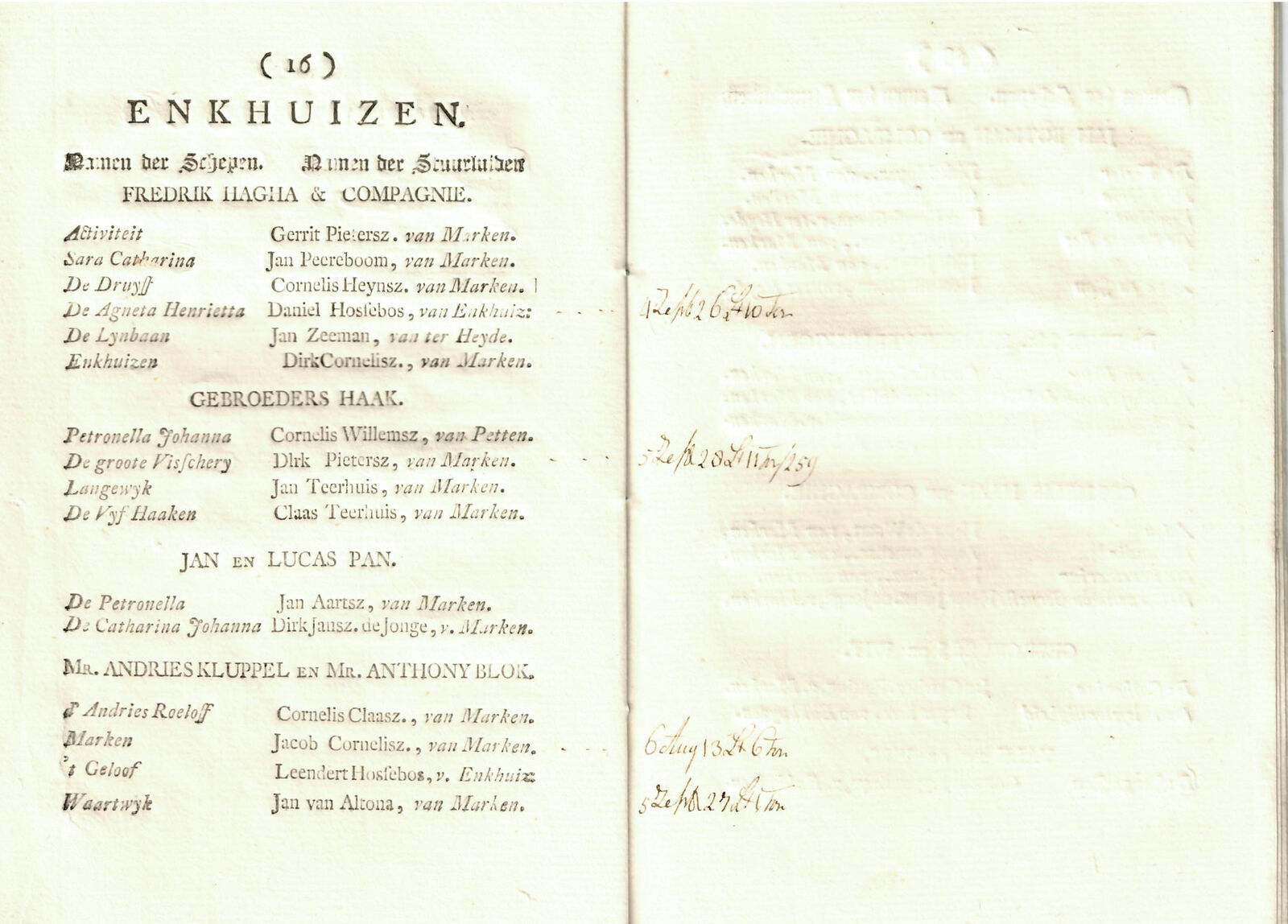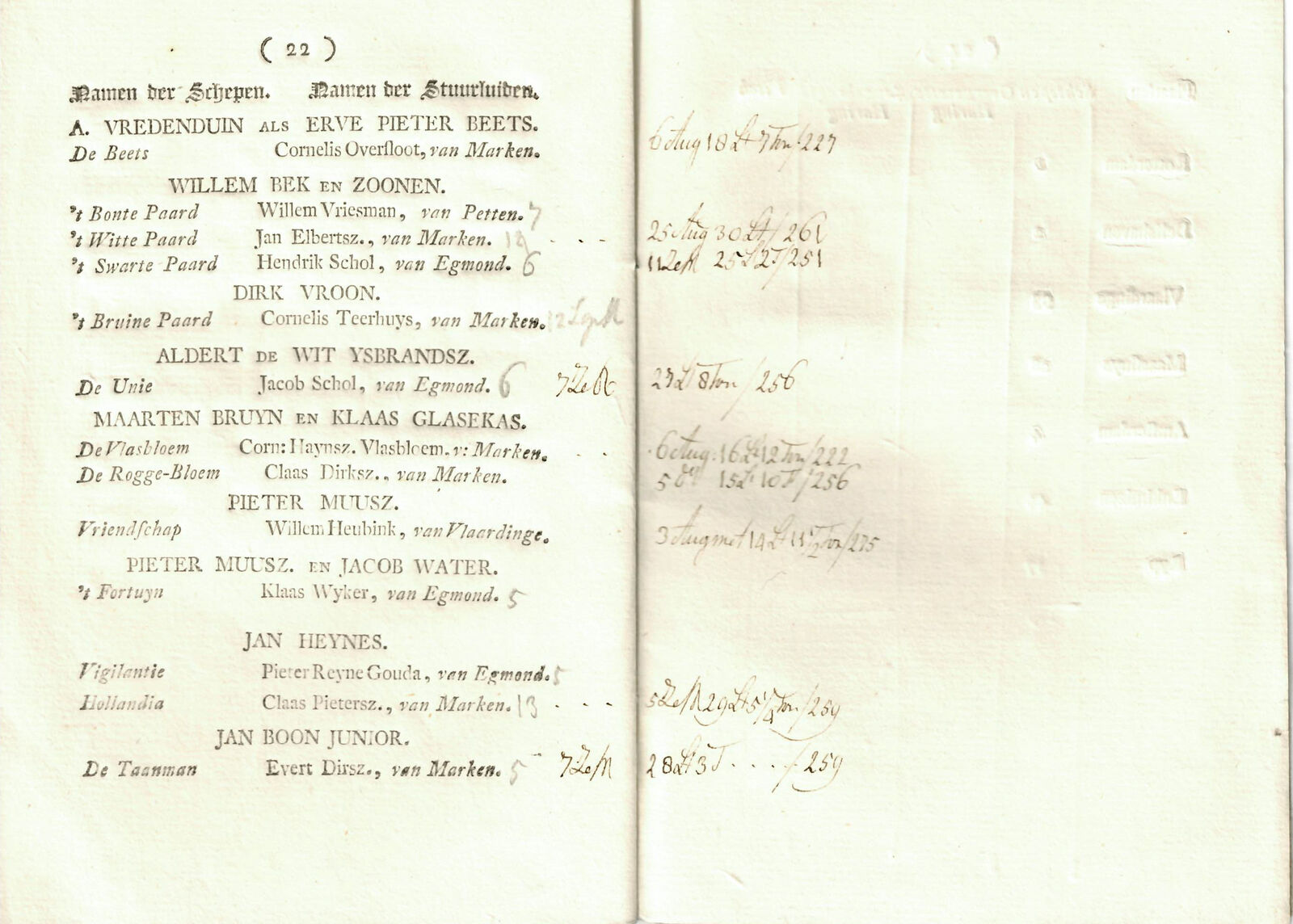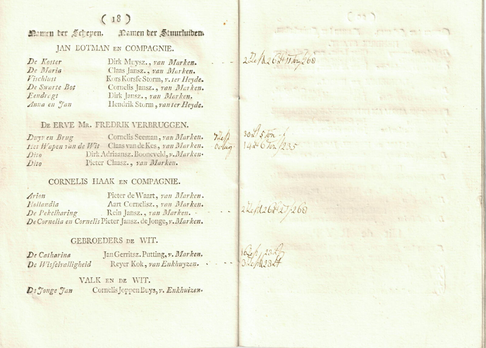 De bron toont een boekje uit 1791, getiteld Naamlyste der boekhouders, schepen en stuurluiden van de haring-schepen in 't jaar 1791. Daarin zijn ook de Marker schippers en hun schepen in die tijd opgenomen. Genoemde namen als (van de) Kes, Peereboom, Teerhuis, Vlasbloem, De Waard en Zeeman klinken nog altijd bekend.
