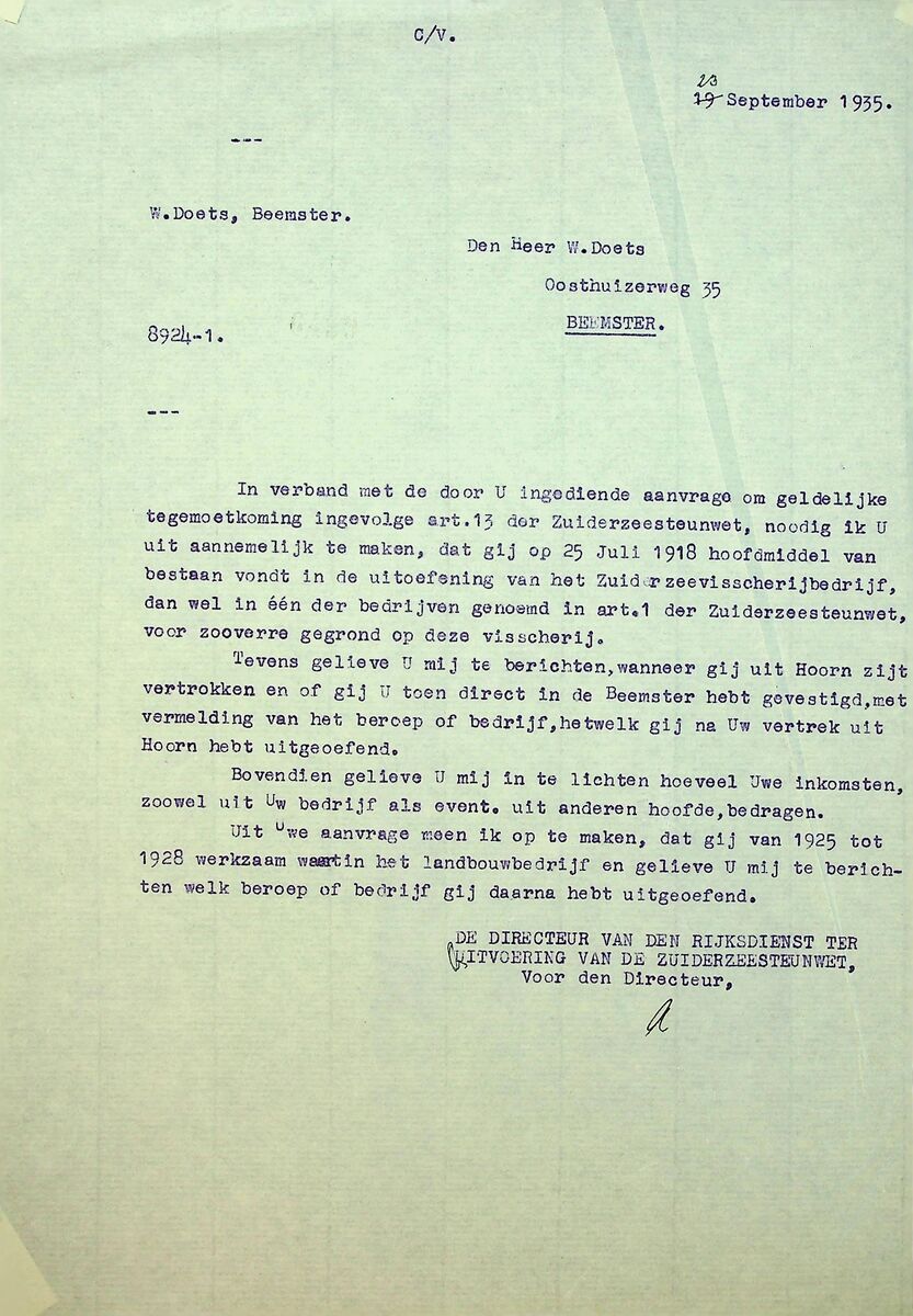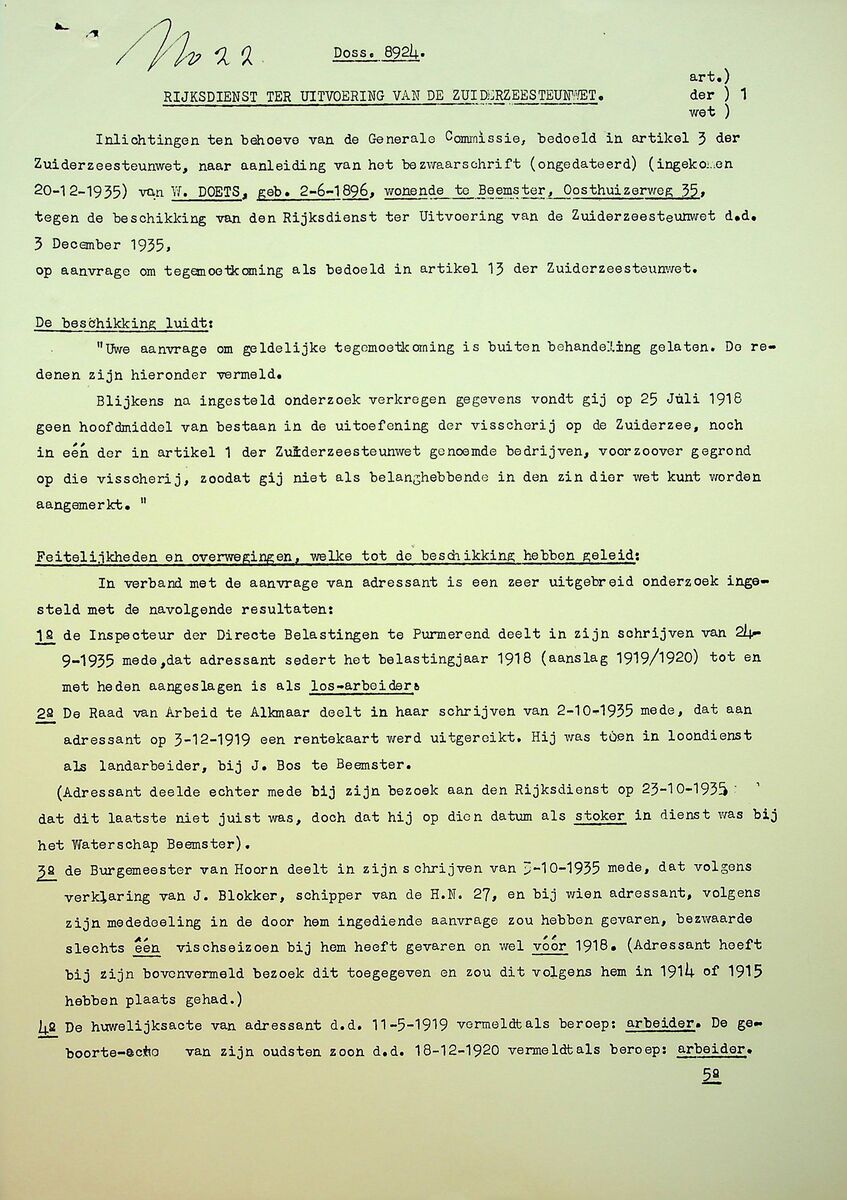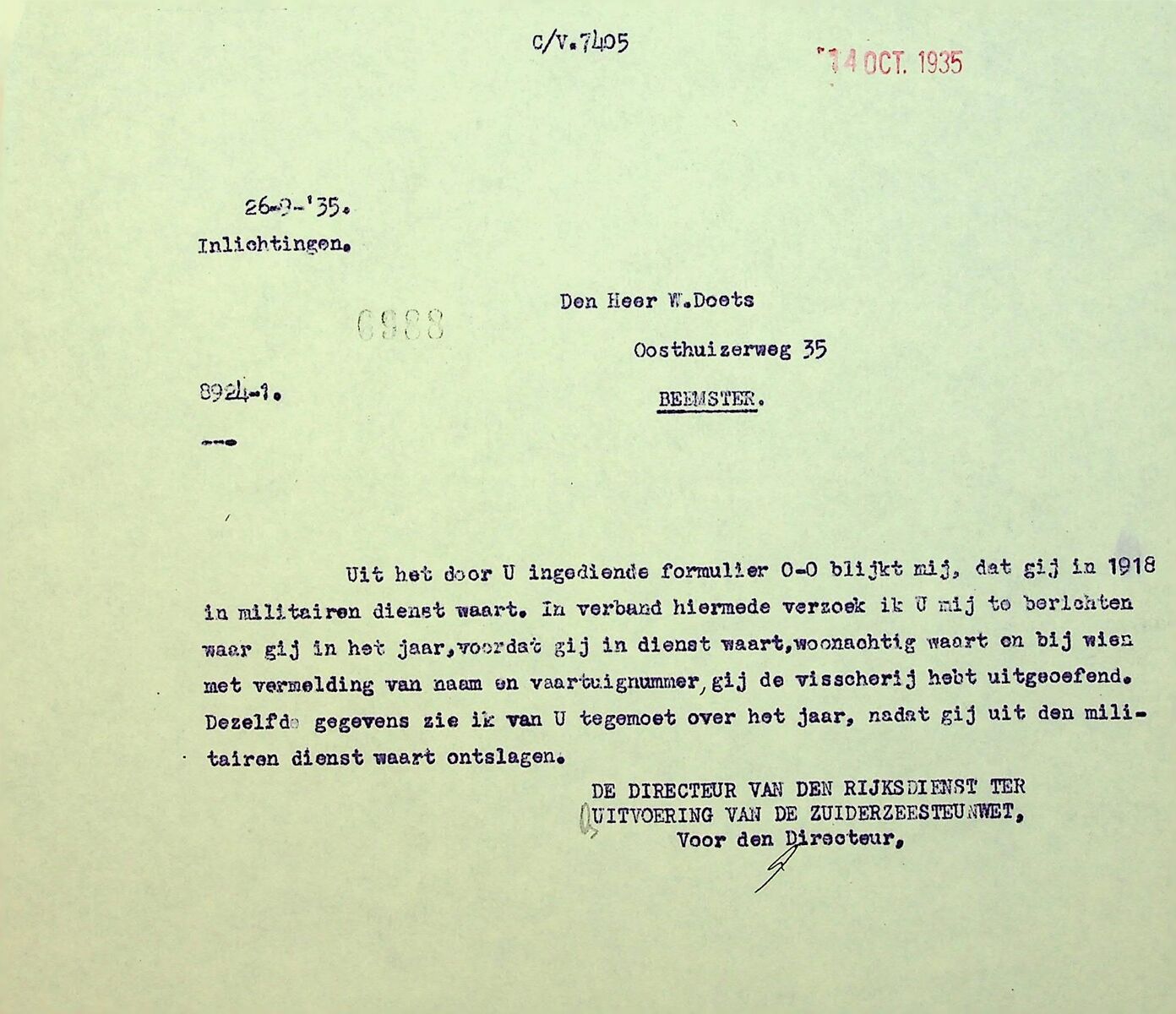 Willem Doets diende in 1935 zijn aanvraag in voor een geldelijke tegemoetkoming op grond van de Zuiderzeesteunwet. Hij beweerde dat hij vóór 1918 werkzaam was geweest als visser op de Zuiderzee, en daarmee recht had op compensatie na het afsluiten van de Afsluitdijk. Maar al snel bleek dat de gegevens die zijn beweringen moesten ondersteunen, moeilijk achterhaalbaar waren. De Rijksdienst startte daarom een onderzoek naar de precieze aard van zijn werkzaamheden op 25 juli 1918 — een datum om te bepalen of Willem in aanmerking kwam voor de steunregeling. De hoofdvraag daarbij was of zijn hoofdinkomen destijds daadwerkelijk uit de visserij kwam.