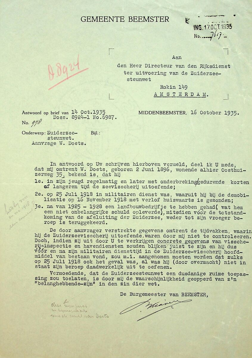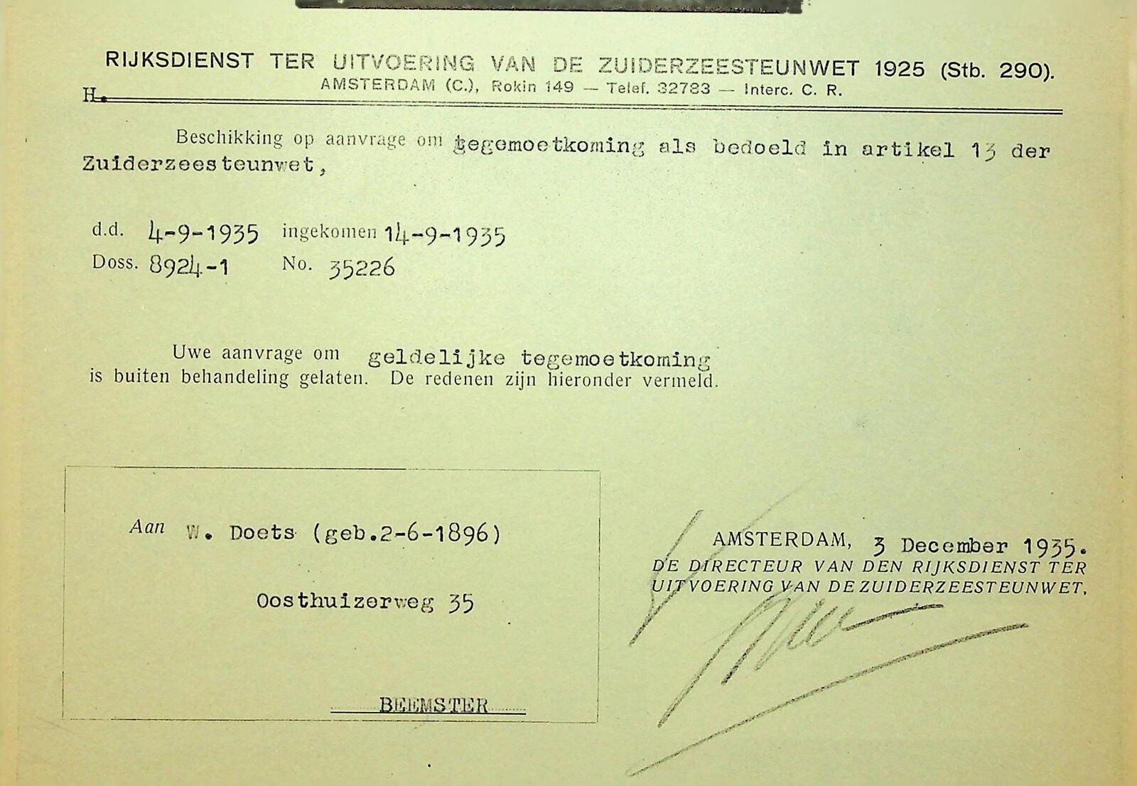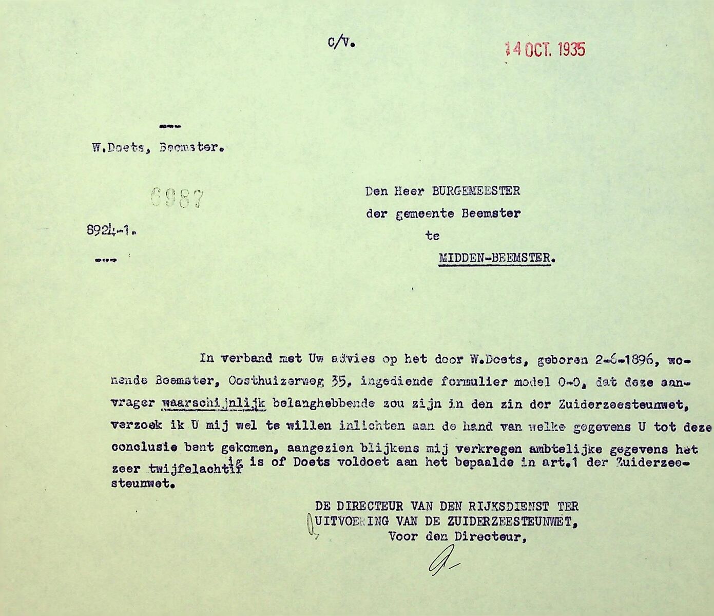 In het steundossier van Willem Doets, geboren op 2 juni 1896 in de Beemster, ontvouwt zich een opmerkelijk verhaal. Het dossier bevat uitgebreide correspondentie tussen de Directeur van de Rijksdienst ter Uitvoering van de Zuiderzeesteunwet en lokale commissies, burgemeesters uit de regio, en Willem zelf. De documenten laten goed zien hoeveel tijd en energie de Rijksdienst stak in het zorgvuldig onderzoeken van elke aanvraag — en hoezeer men er tegelijkertijd op gebrand was om geen uitkering toe te kennen.
