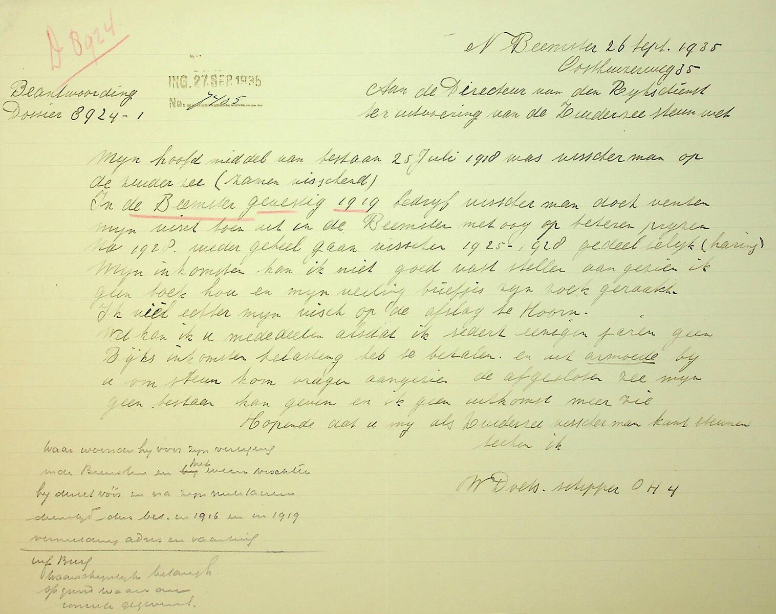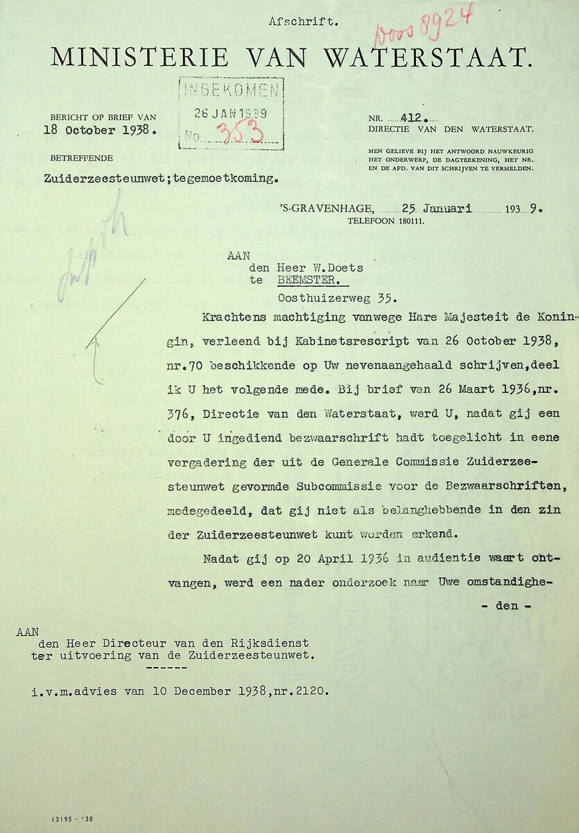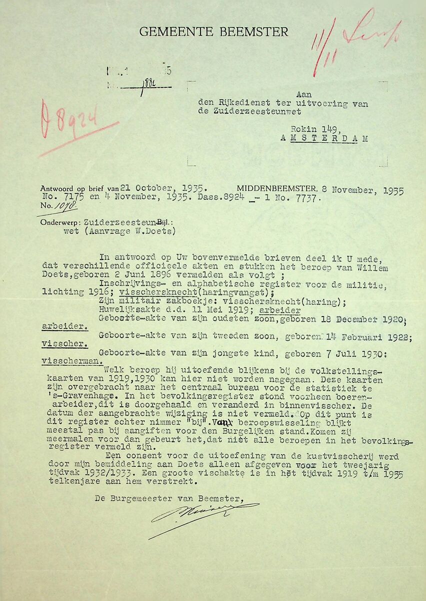 In het steundossier van Willem Doets, geboren op 2 juni 1896 in de Beemster, ontvouwt zich een opmerkelijk verhaal. Het dossier bevat uitgebreide correspondentie tussen de Directeur van de Rijksdienst ter Uitvoering van de Zuiderzeesteunwet en lokale commissies, burgemeesters uit de regio, en Willem zelf. De documenten laten goed zien hoeveel tijd en energie de Rijksdienst stak in het zorgvuldig onderzoeken van elke aanvraag — en hoezeer men er tegelijkertijd op gebrand was om geen uitkering toe te kennen.