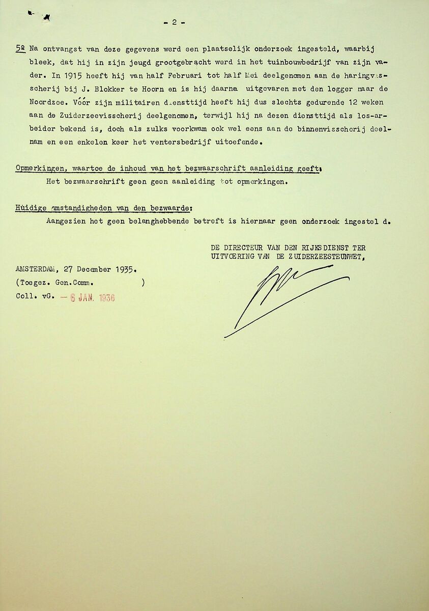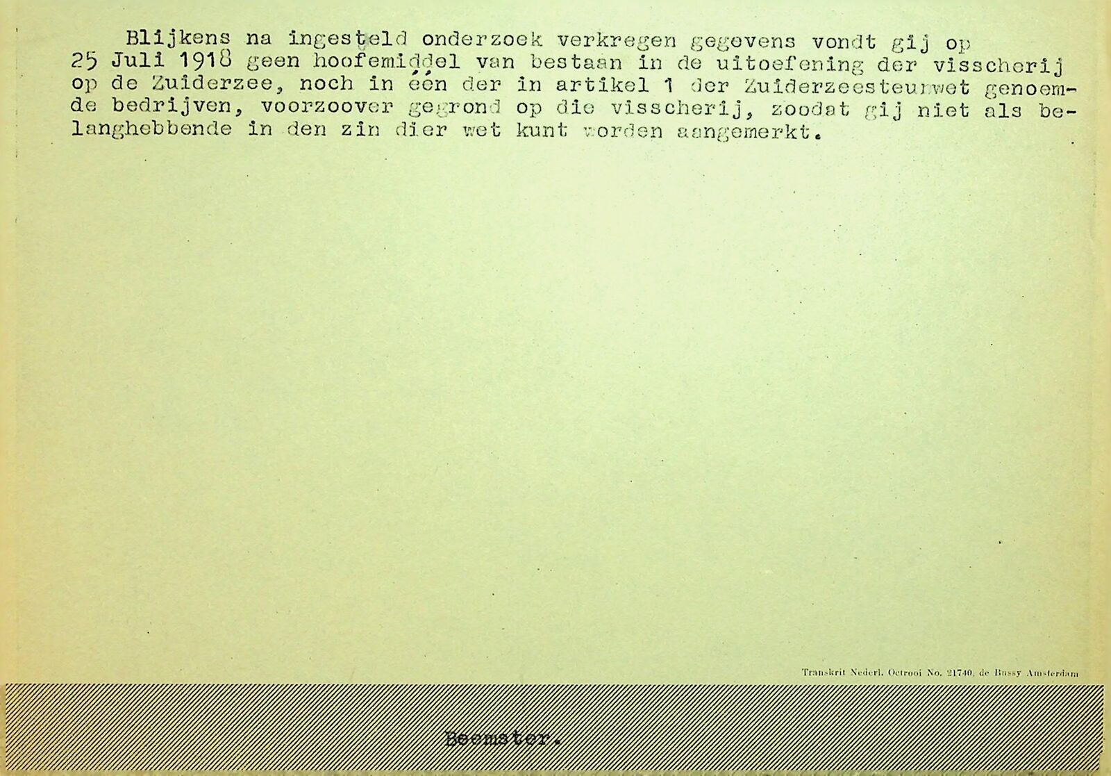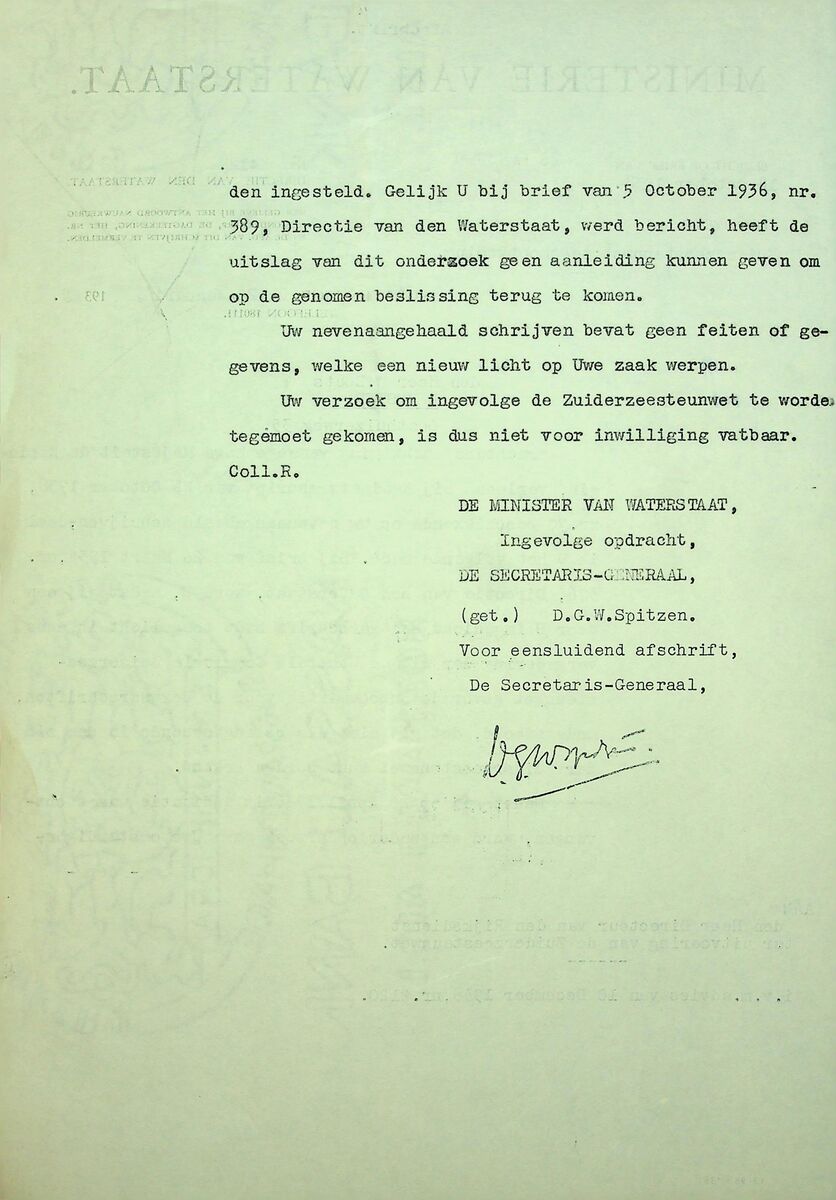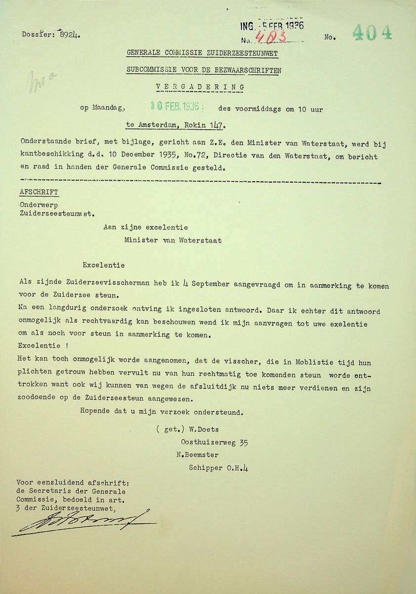 "Excelentie. Als zijnde Zuiderzeevisscherman heb ik 4 september aangevraag om in aanmerking te komen voor de Zuiderzee steun. Na een langduuring onderzoek ontving ik ingesloten antwoord. Daar ik echter dit antwoord onmogelijk als rechtvaarig kan beschouwen wenk ik mijn aanvragen tot uwe exelentie om als noch voor steun in aanmerking te komen.