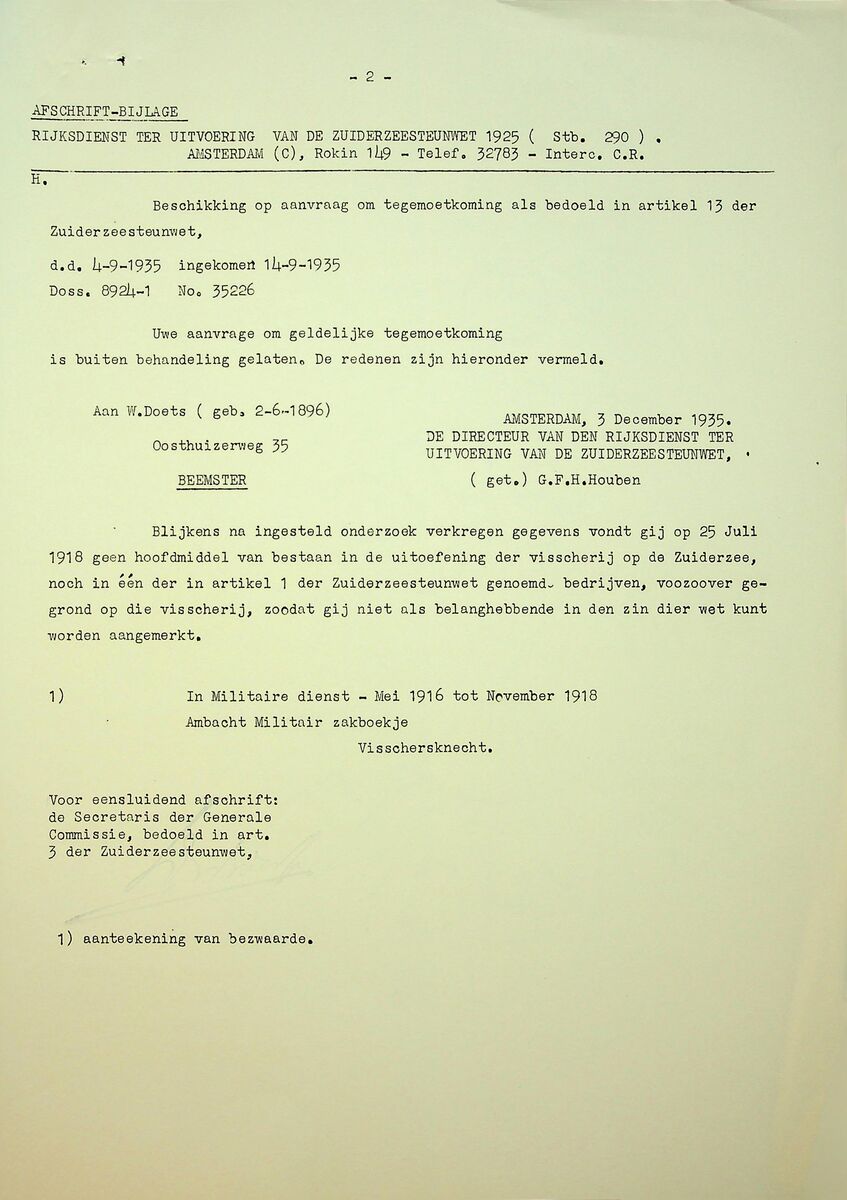 Hoewel de burgemeester steldedat Willem door overmacht zijn beroep tijdelijk had moeten neerleggen, en dat zijn hoofdinkomen in normale omstandigheden wel degelijk uit de visserij kwam, oordeelde de Rijksdienst anders. De dienst vond het moeilijk om met zekerheid vast te stellen wat zijn hoofdinkomen op de peildatum was — en wees de aanvraag uiteindelijk af. Daarbij speelde vermoedelijk ook mee dat Willem tussen 1925 en 1928 een landbouwbedrijf had, waarmee hij in die jaren dus aantoonbaar geen visser was.