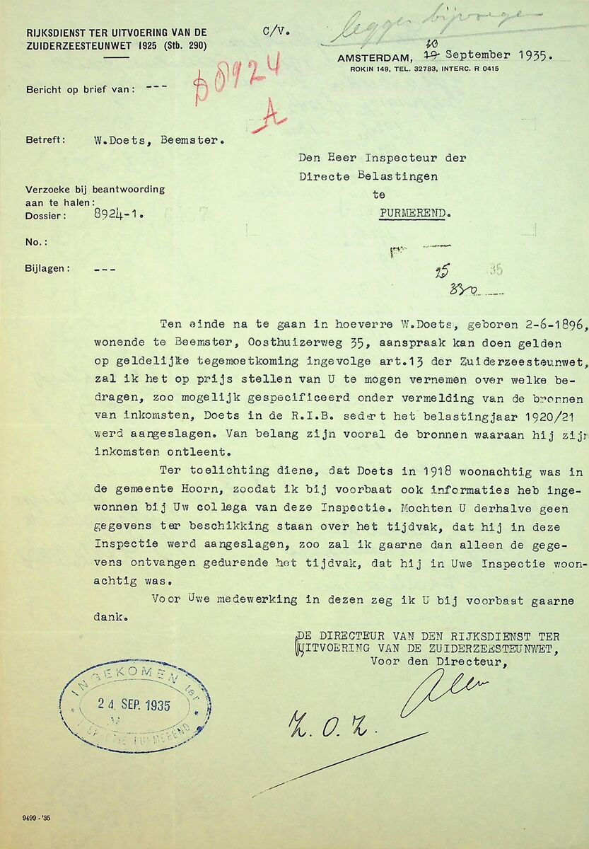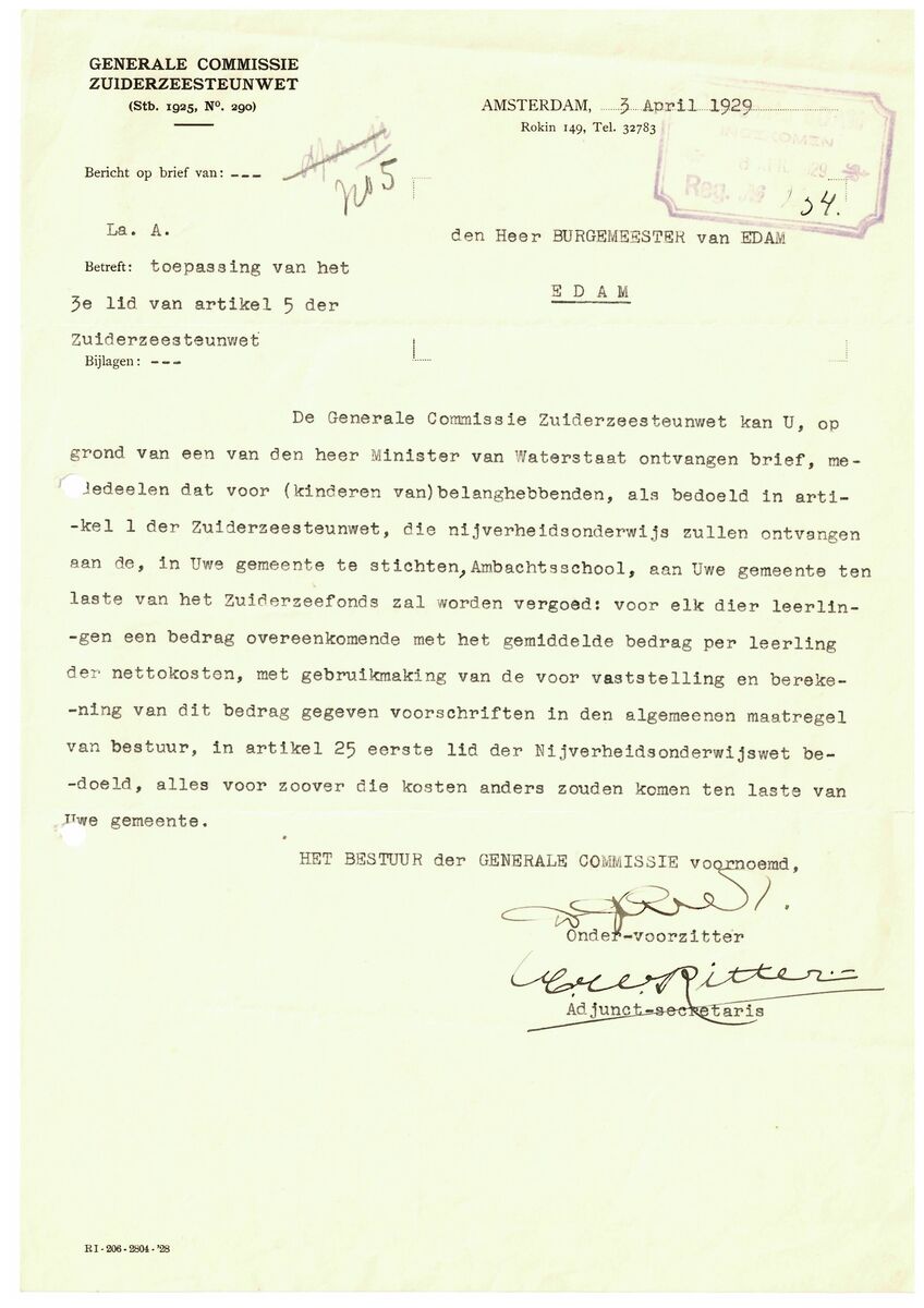 Brief van de Generale Commissie Zuiderzeesteunwet van 3 april 1929 aan de burgemeester van de gemeente Edam. Daarin staat dat de Minister van Waterstaat toestemming heeft gegeven om opleidingen aan de nieuw te stichten ambachtsschool in Edam te vergoeden. De toestemming is alleen bestemd voor leerlingen waarvan de ouder(s) in aanmerking komen voor financiële steun vanuit de Zuiderzeesteunwet.