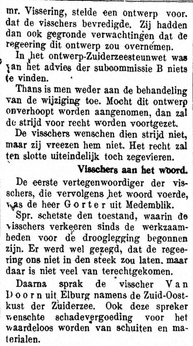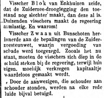 Toen de overheid plannen maakte om de Zuiderzee af te sluiten met de Afsluitdijk, maakten veel vissers zich weinig zorgen. Ze twijfelden aan de haalbaarheid en dachten dat het nog jaren zou duren. Bovendien beloofde de overheid financiële steun, wat hoop gaf. Maar toen de bouw begon, bleek die steun veel minder dan verwacht. Vissers kregen slechts kleine bedragen en verdere hulp bleef uit. De onrust groeide: ze zagen hun werk verdwijnen en hun dorpen veranderen. Al snel klonk de leus: "De Afsluitdijk voltooid, de visserman berooid."